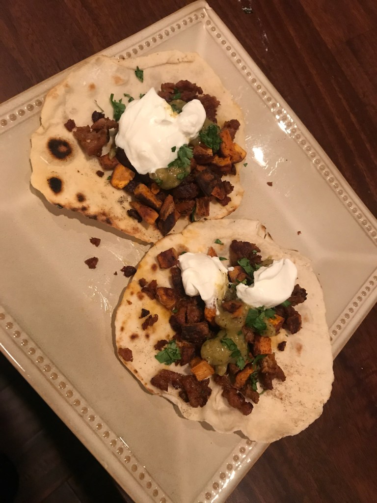 My signature taco is crumbled chorizo, diced roasted sweet potato, salsa verde, sour cream and cilantro in a homemade flour tortilla. Obvious disclaimer: NO, this is not an authentic Mexican or Tex-Mex recipe. YES, this is what I make for myself and like to eat. Enjoy!