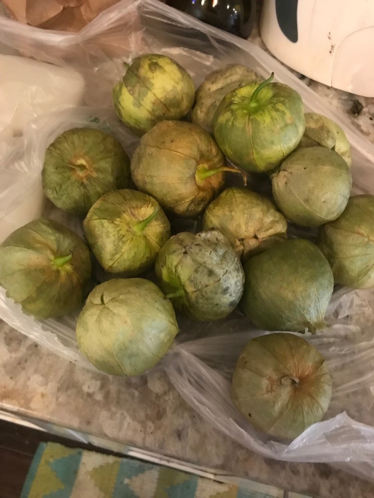 Tomatillos. These are them. They’re green, have papery-leaf wrapper and are a little sticky underneath that. You’ll likely find one little tiny pile at your regular grocery store, a plentiful amount at a Latin market, and I got these at the farmers market! Tangy, almost lime-y flavor; firmer and less juicy than tomatoes (they are NOT green tomatoes), almost a crisp texture in the very center. Peel the papers off, rinsing a bit if needed to get them clean. Ready to use!