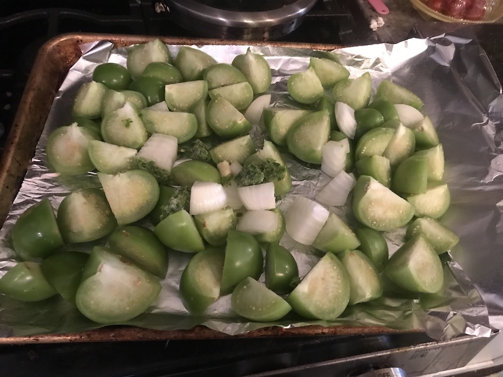 Ingredients: A bunch of tomatillos (1 – 1 1/2 lbs—I happened to grab 15 of them), one small onion, one or two serrano or jalapeño peppers (seeds and ribs removed for less spicy, more peppers for spicier), couple cloves garlic. Roughly chop everything, no need to dice small, cause we’re gonna purée later. Toss with olive/vegetable oil, lime juice and salt.