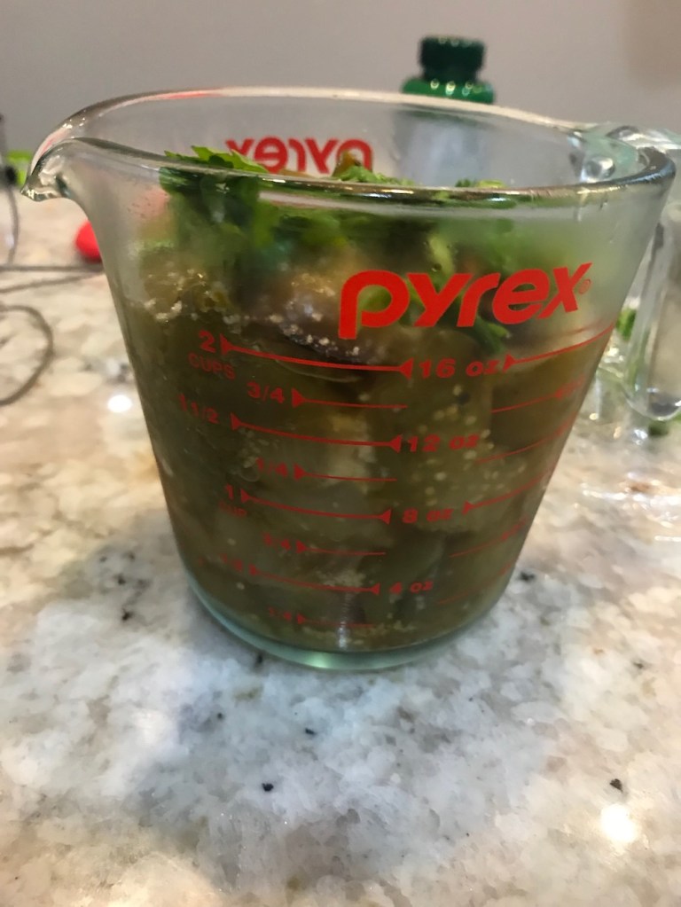 All the charred chunks and juices in a measuring cup (a little condensation on the glass from sitting in the fridge a couple days—again, I am in charge of this salsa verde; it fits *my* schedule), add some cilantro, whiz with the immersion blender or anything else you have with spinning blades (blender or food processor).